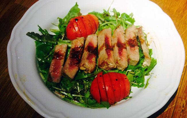 - Mix a little soy sauce with olive oil and a drop of balsamic vinegar and drizzle the mixture over the tuna steak salad. Serve immediately.